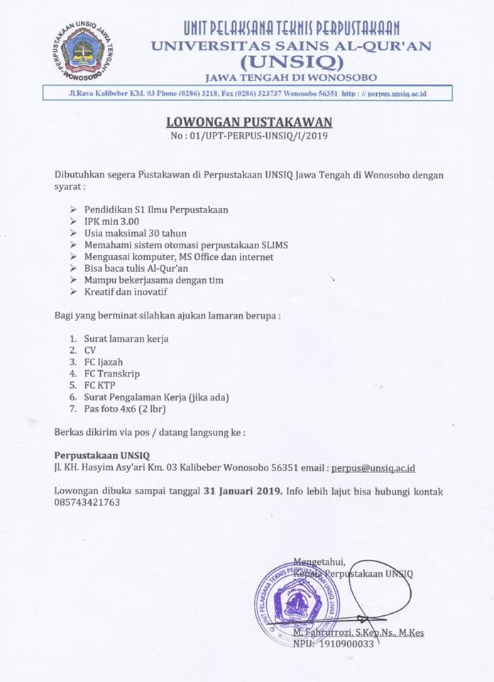 Yak betul kang mas dan mbak yu semua.... UNSIQ aka Universitas Sains Al-Qur'an Wonosobo Jateng membutuhkan pustakawan, segera. Adapun syarat dan ketentuannya adalah sebagai berikut. Monggo simak piyambak.... ^_^